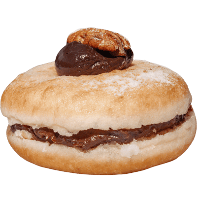 Recheio de creme de chocolate Meio Amargo e Nozes picadas. Cobertora Açucar confeiteiro e uma Noz Pekan.